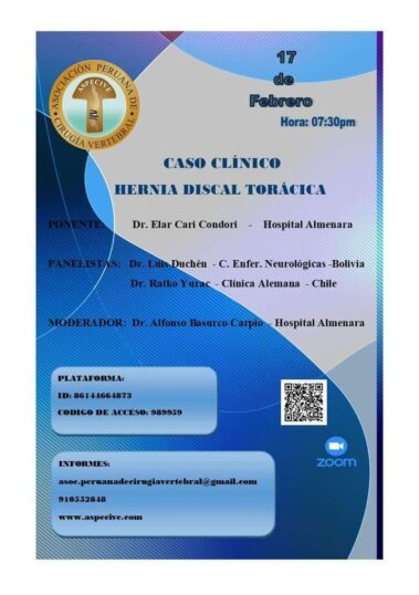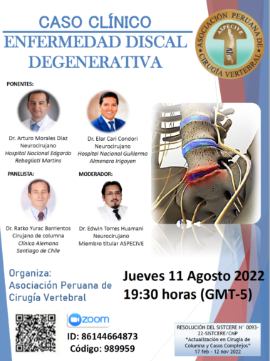 Los casos clínicos, son realizados una vez al mes, donde un cirujano de columna, presenta un caso de interés y se debate opciones diagnosticas, de tratamiento y quirúrgicas, teniendo como invitados a 2 cirujanos de columna experimentados nacionales o internacionales.